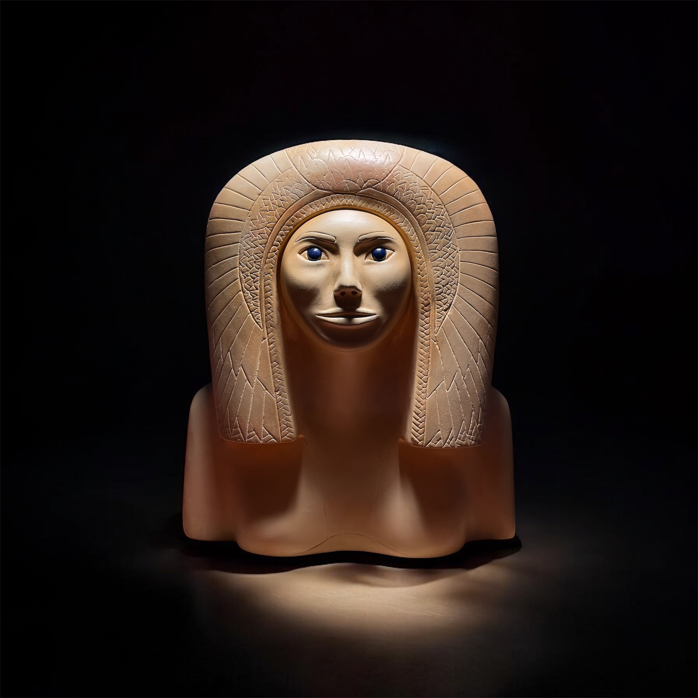 In The Lady Who Unites, the eyes are made of lapis lazuli, the semiprecious stone that in ancient Egypt symbolized divine wisdom, protection, and eternal sight. This choice is not decorative but allegorical — linking the face of contemporary political presence with the sacred aura of ancient power depictions. The eyes thus become a symbol of penetrating vision, foresight, and influence.